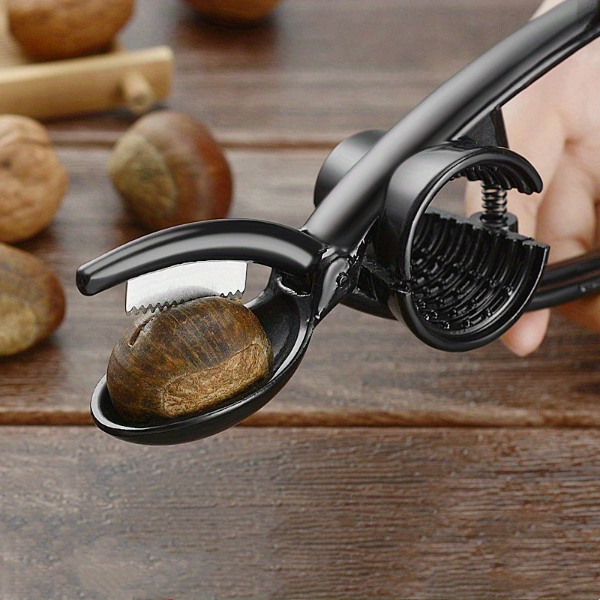 2'si 1 arada kestane çizici ve ceviz kıracağı, kestane, ceviz, fındık gibi sert kabuklu yemişlerin kolayca kırılmasını sağlar. Aynı zamanda kırma işlemi sırasında iç kısmın zarar görmesini en aza indirir. Ergonomik dostu sap yapısı sayesinde kolay kavrama ve rahat kullanım sunar. Üst kısmında bulunan dişli yapı, özellikle kestane gibi kabuğu sert ama iç kısmı hassas olan gıdalarda kontrollü kesim yapılmasına olanak tanır. Dayanıklı metalden üretilmiştir, uzun ömürlü kullanım için uygundur. Kırma sırasında elden kaymayı önleyerek güvenli kullanım sağlar.