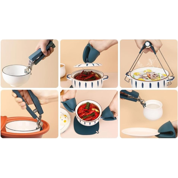 1 adet metal tencere tutucu, 1 adet metal tabak tutucu, 2 adet silikon fırın eldiveni2 adet silikon bulaşık fırçası