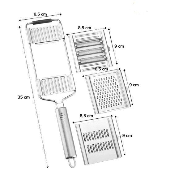 Ayarlanabilir 3 Farklı Başlıklı Tutmalı Kaydırmaz Taban Paslanmaz Çelik Sebze Dilimleyici Peynir Rendeleyici Aparat sayesinde artık tüm sebze,meyve ve peynirlerinizi dilimlemek çok pratik. 3 Farklı bıçağı sayesinde tüm sebze, meyve ve sebzeleri dilimleyebilir ve rendeleyebilirsiniz.