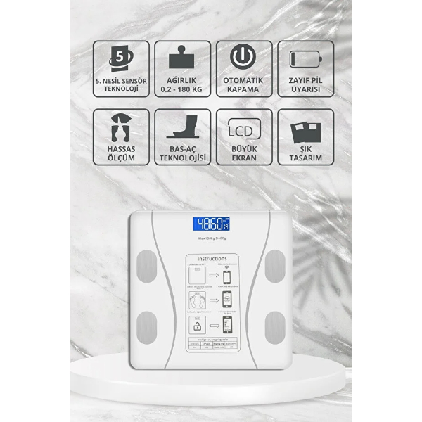 Modern yaşamın vazgeçilmez sağlık yardımcısı olan Beyaz Renk Bluetooth Özellikli Akıllı Tartı, yalnızca kilonuzu değil, aynı zamanda vücut kompozisyonunuzu da detaylı şekilde analiz eder. Gelişmiş sensör teknolojisiyle donatılan bu akıllı tartı, vücut yağı, su oranı, kas kütlesi, kemik kütlesi, protein oranı, visseral yağ, BMI (Vücut Kitle İndeksi) ve BMR (Bazal Metabolizma Hızı) gibi verileri yüksek hassasiyetle ölçer.Bluetooth bağlantısı sayesinde akıllı telefon uygulamasıyla kolayca eşleşir ve ölçüm sonuçlarını anlık olarak kaydeder. Böylece zaman içerisindeki vücut değişimlerinizi takip etmenize imkân tanır. LCD ekranı, ölçüm sonuçlarını net bir şekilde gösterirken, otomatik kapanma özelliği pil ömrünü uzatır ve enerji tasarrufu sağlar. Maksimum 180 kg kapasiteye sahip dayanıklı yapısı, uzun ömürlü kullanım sunar.Şık, sade ve modern tasarımı ile her banyo, spor salonu ya da sağlık merkezine estetik bir dokunuş katar. Hem günlük kullanım hem de profesyonel fitness takibi için mükemmel bir yardımcıdır.