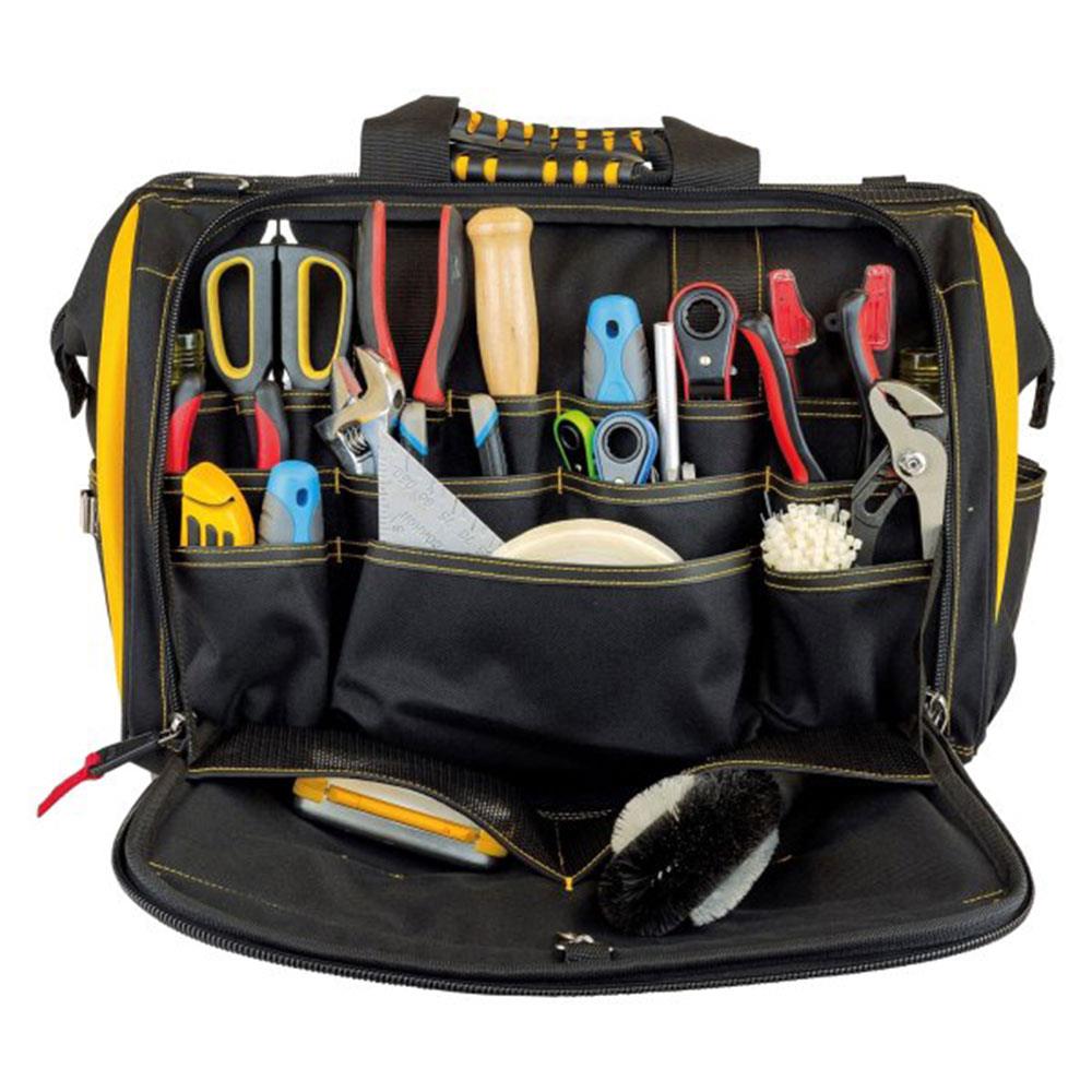 • CAT 18'' geniş ağızlı, çok bölmeli ağır hizmet tipi alet takım çantası maksimum alet taşıma kapasitesi için toplam 56 cep ve geniş düz ve düzenli bir iç alana sahiptir.