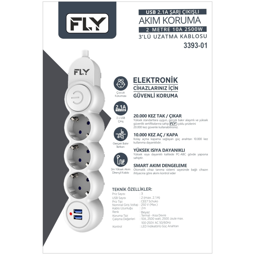 FLY 3393-01 USB ÇIKIŞLI 3'LÜ UZATMA KABLOSU