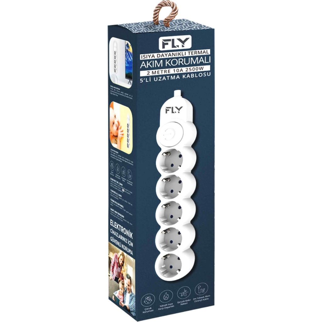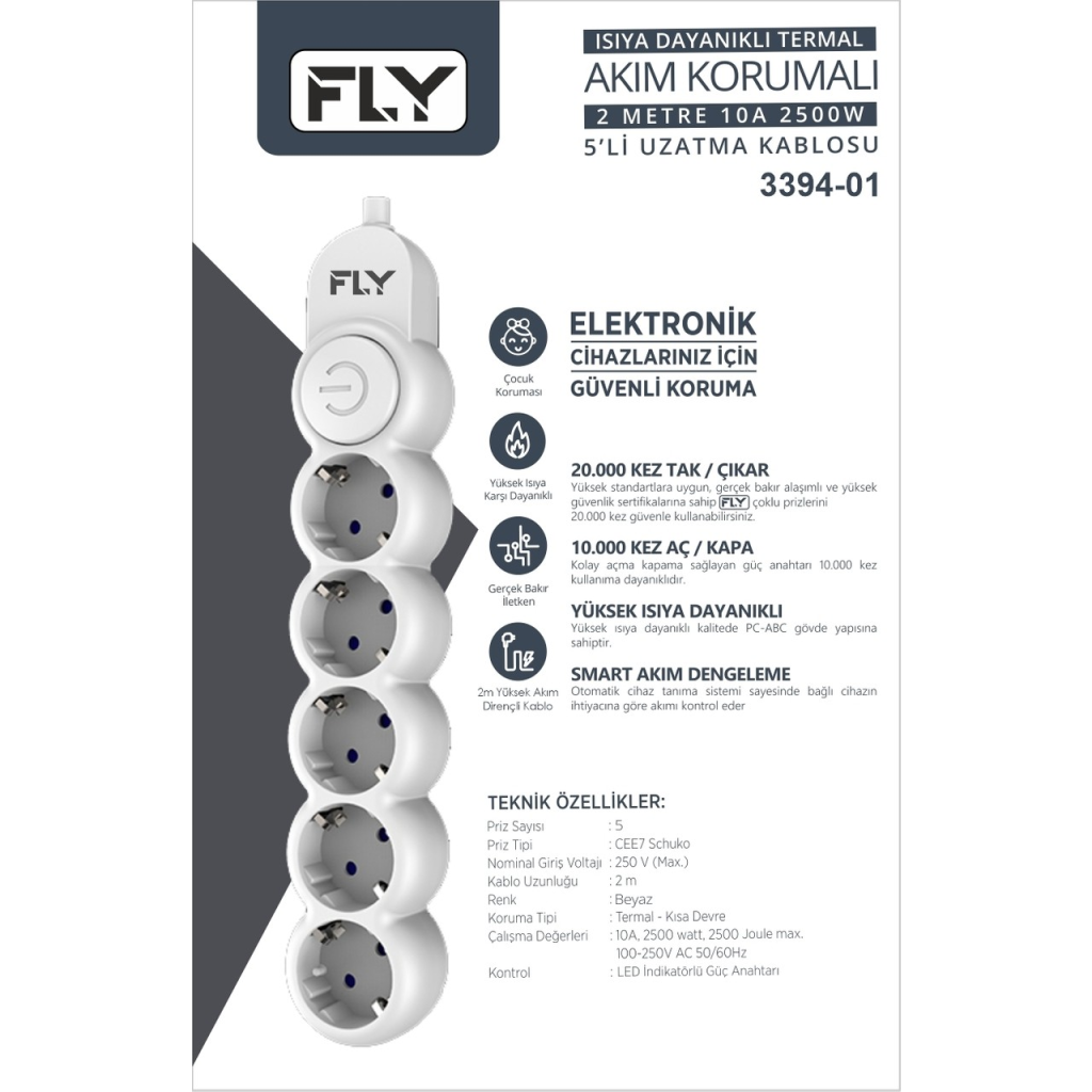 FLY FLY-3394-01 5'li Akım Korumalı Priz,2m,10 A 2500W
