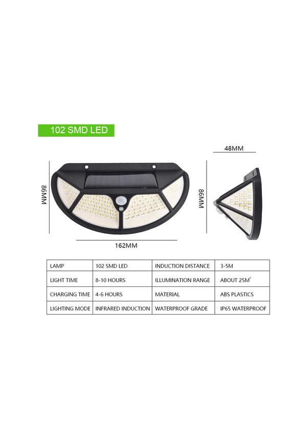 Fonksiyonel Sensörlü 102 Ledli Solar Bahçe LambasıBahçe balkon teras gibi dış mekanlarınız aydınlık ve dekoratif olması için güneş enerjili solar bahçe aydınlatma – solar lamba.Solar güneş enerjili bahçe aydınlatmanız sabahleyin güneş enerjisi ile kendini şarj eder , gece olunca sensörü sayesinde otomatik yanar.Balkonda , bahçede , pencerede , terasta kabloya gereksinim duymadan kolayca kullanabilirsiniz.Ürün Özellikleri;Malzeme: ABS plastikTipler: 102 LED (tip1)Hücre: Dahili 1*3.7V 1200mAh şarj edilebilir pilVoltaj: 220VGüçler: 10WIşık efekti: Hassas Işık Kontrolü+ PIR hareket sensörüIşık rengi: BeyazŞarj saatleri: 4-6 saatÇalışma saatleri: 8-10 saatSu direnci: IP65Algılama açısı: 120°Algılama mesafesi: 1-3 metreAydınlatma aralığı: 15㎡(tip1)Paket boyutu: 170*90*60mm/6.69*3.54*2.36inPaket ağırlığı: 169g/5.96ozPaket İçeriği;1 adet Solar Güneş Enerjili 102 Cob Ledli 3 Modlu Hareket Sensörlü Oval Bahçe Lambası