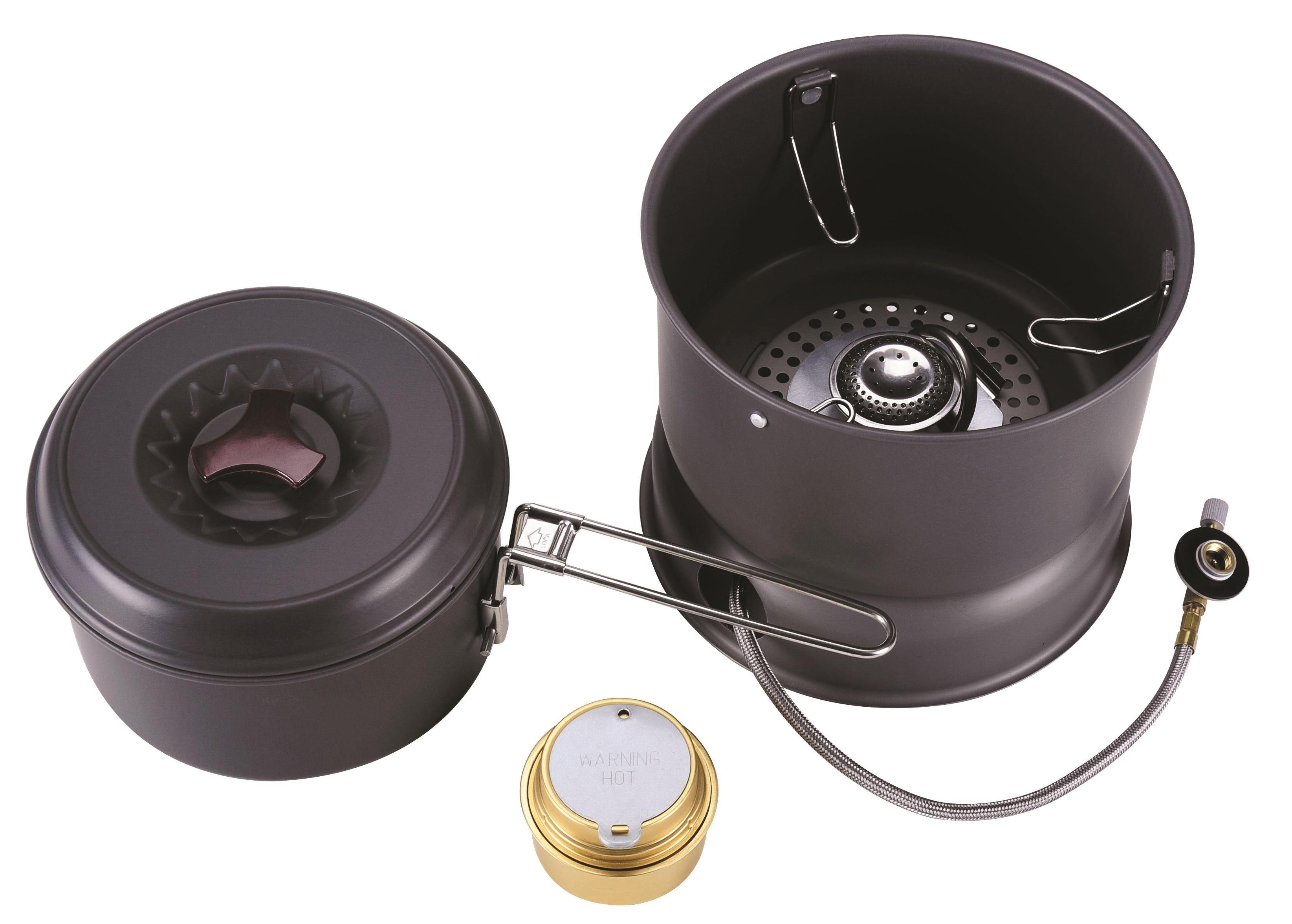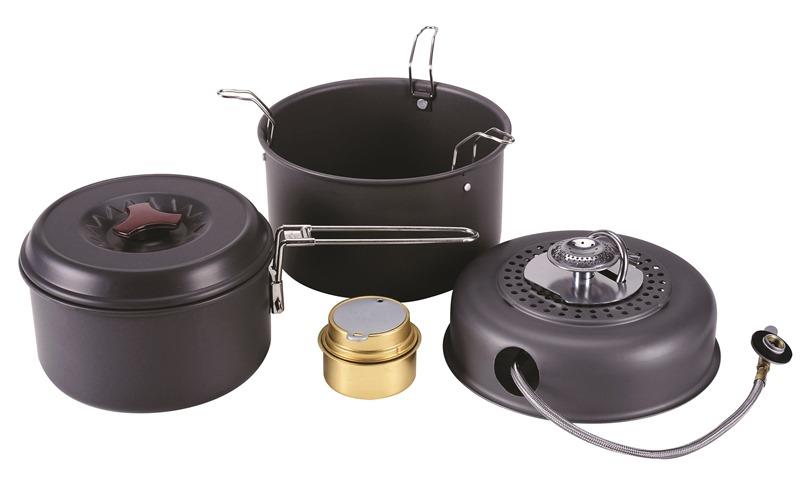 Benzin, ispirto, yanıcı jel ve gazla kullanılabilen portatif alüminyum tencere seti toplamda 6 parçadan oluşmaktadır.
