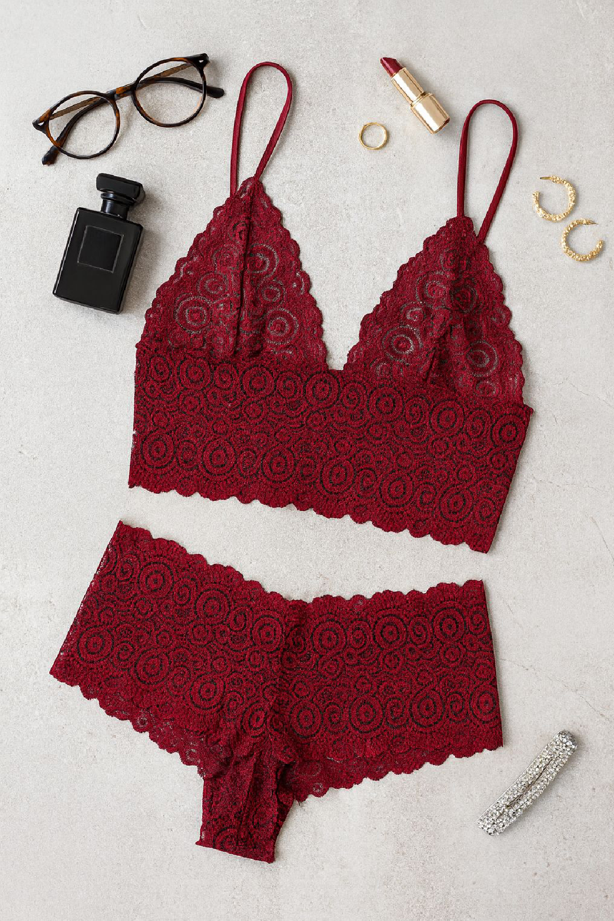 - Asaletin ve zarif şıklığın buluştuğu bordo dantel bralet şort takımı, sofistike görünümüyle fark yaratır.