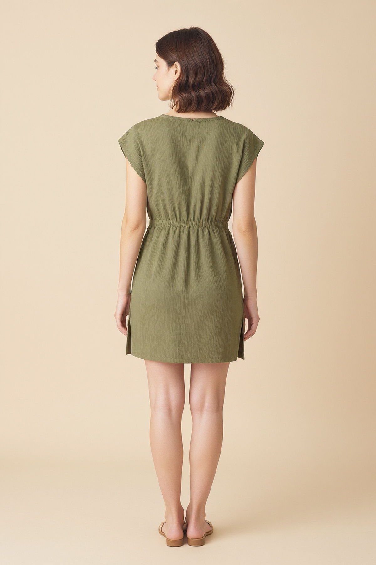Haki tonunun doğallığıyla yazın enerjisini yansıtan bu elbise, her vücut tipine uyum sağlayan rahat kesimiyle dolabınızın favorisi olacak.