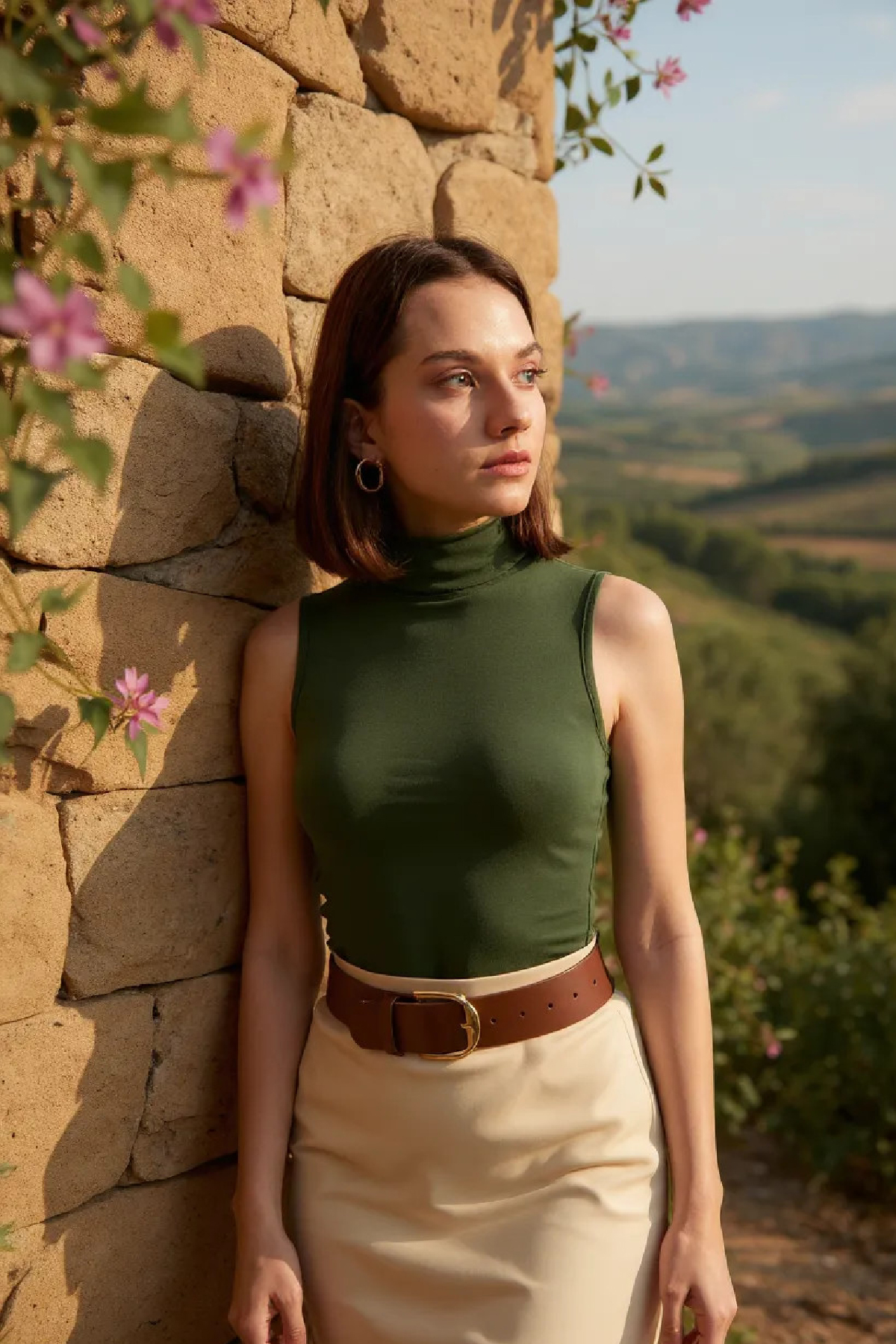 Doğadan ilham alan tonuyla öne çıkan kadın haki yeşili kolsuz basic bluz, günlük kombinler ve modern şehir stilleri için mükemmel bir seçimdir.