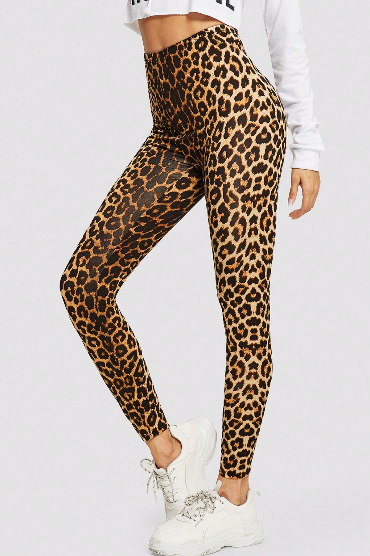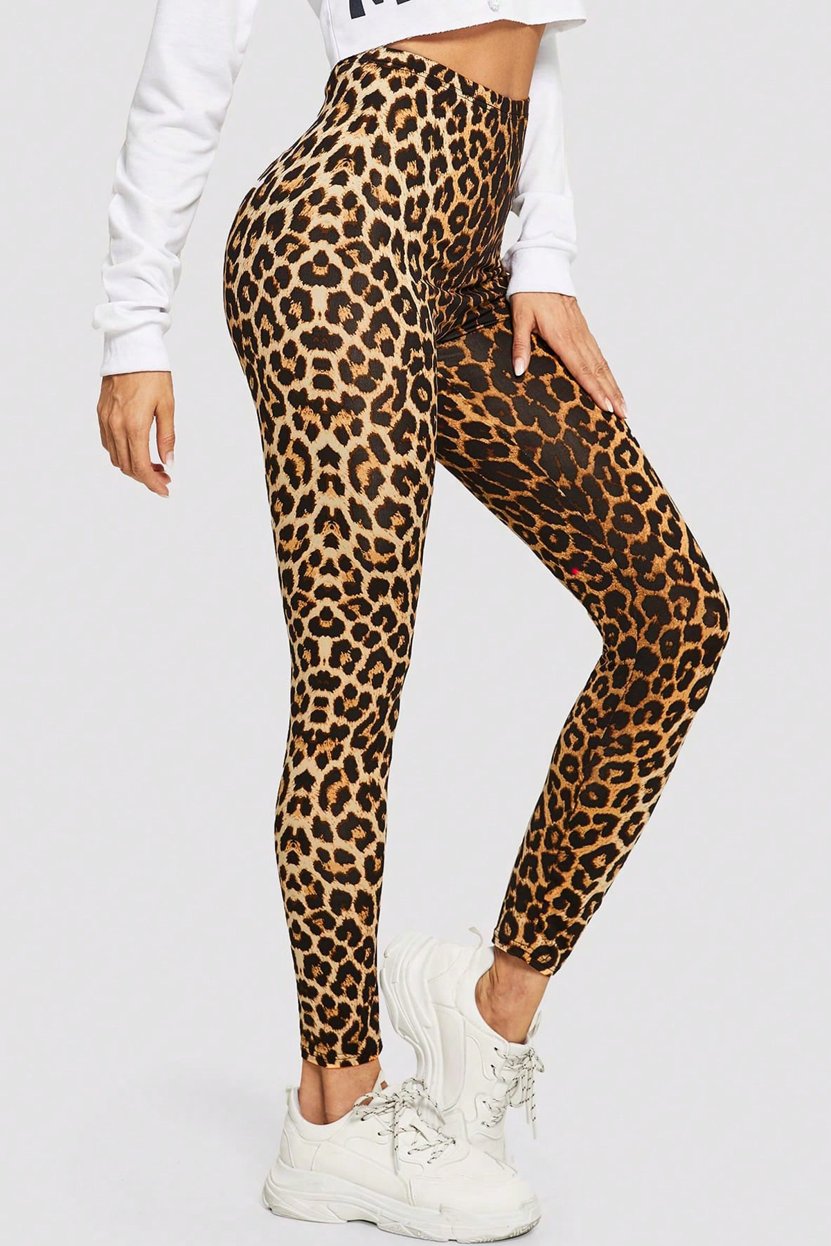 - Leopar deseniyle dikkat çeken yüksek bel dar tayt, spor şıklığınızı tamamlar.