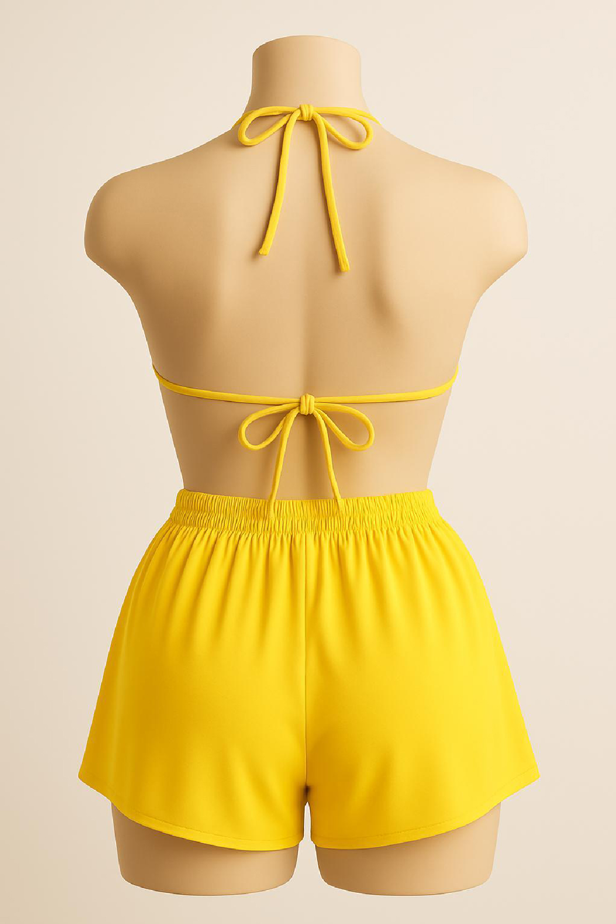- İki parçadan oluşan set; üst parça olarak bralet bikini üstü ve alt parça olarak şortlu bikini altını içerir.