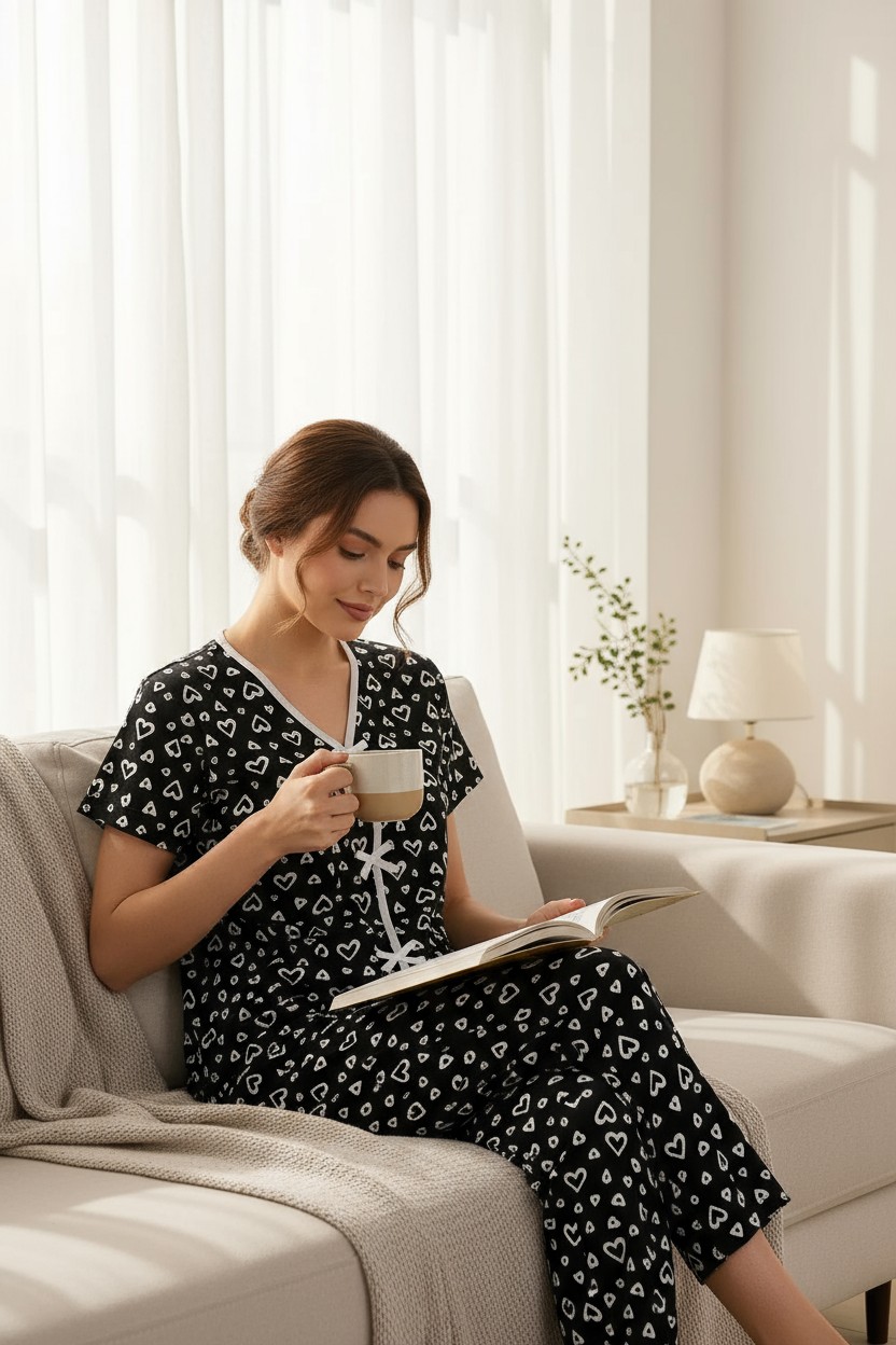 Gecelerinizi konforlu,gündüzlerinizi şık hale getiren kadın siyah kalp desenli pijama takımı,