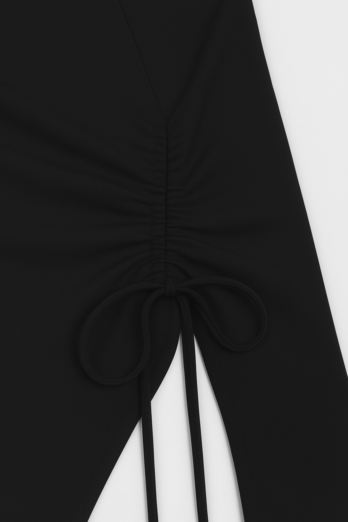 - Asimetrik yakasıyla omuz hattını zarif bir şekilde ön plana çıkarırken, yan kısmındaki bağlama detayı vücuda oturan formu destekler ve kusursuz bir siluet oluşturur.