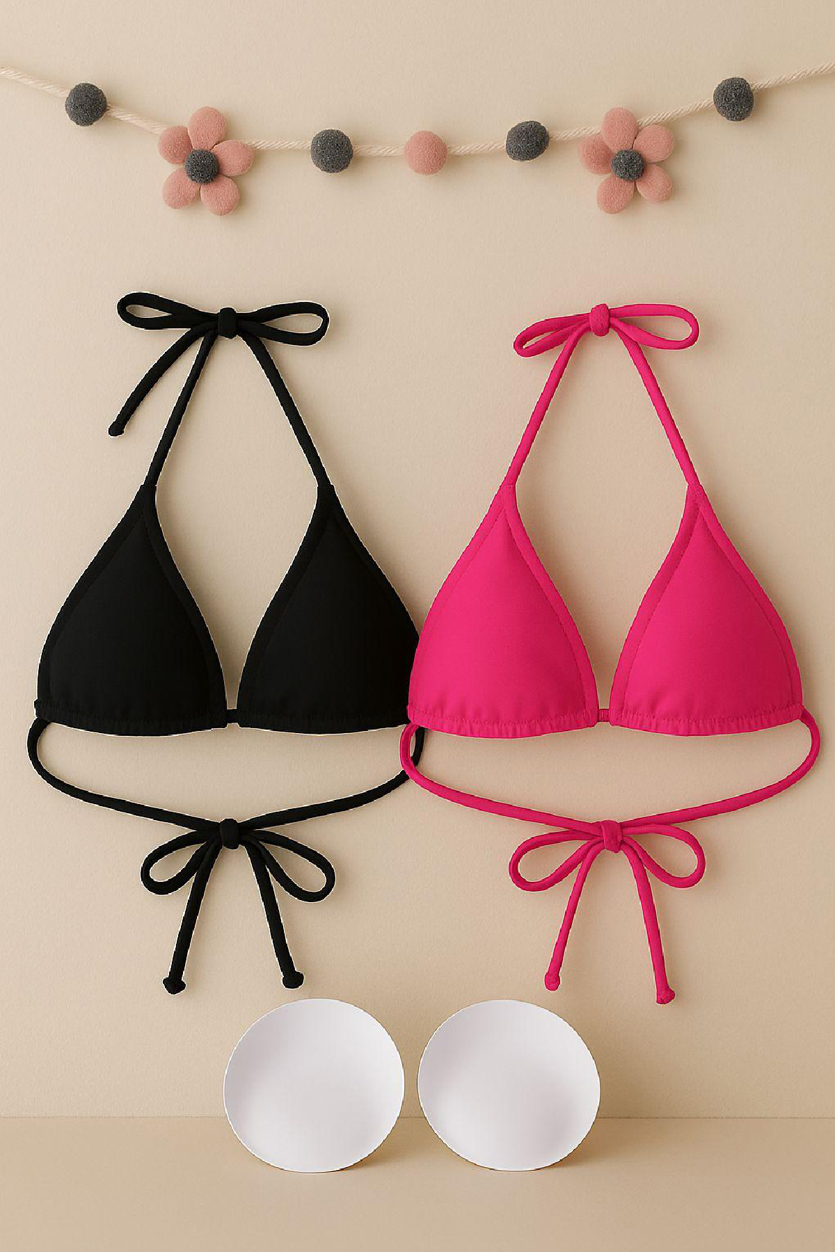 - Zarif siyah ve canlı fuşya renk kombinasyonu ile dikkat çeken üçgen bikini üstü, plaj modasına şıklık katıyor.