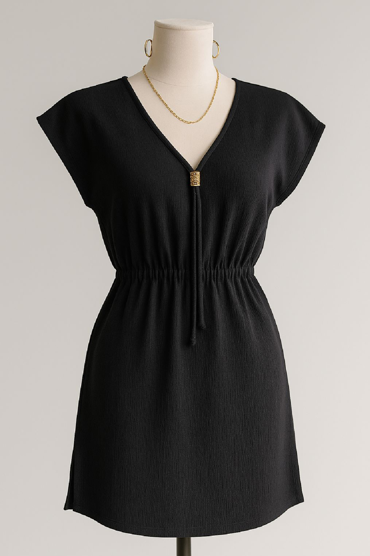 - Kadın Siyah Yanları Yırtmaçlı Tokalı V Yaka Mini Plaj Elbisesi, hem plajda hem de şehir hayatında şıklığınızı tamamlayacak zamansız bir parçadır.