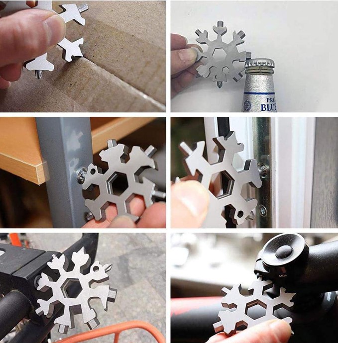Kar Tanesi Çok Amaçlı Anahtarlık AçacakÜrün ÖzellikleriKar tanesi anahtarları son derece çok yönlüdür. Şişe açacağı, kutu açacağı, tornavida, emniyet çekiç, altıgen anahtar vb. Olarak kullanılabilir.18+1 çeşit düz yıldız tornavida, alyan, civata anahtarı, meşrubat açacağı, koli kesme gibi bir çok işlerinizi tek ürünle çözebilirsiniz.Avuç içine sığan küçük boyutu ile cebinizde veya çantanızda kolaylıkla taşıyabilirsiniz.Paslanmaz çelikten üretilmiştir.Her evde, araçta ve özellikte bisiklette motosiklet gibi ulaşım araçlarında bulunması gereken müthiş bir ürün.Dağcılık veya yürüyüş gibi açık hava sporlarında yanınıza almalısınız. Paket İçeriği1 Adet Kar Tanesi Çok Amaçlı Anahtarlık Açacak