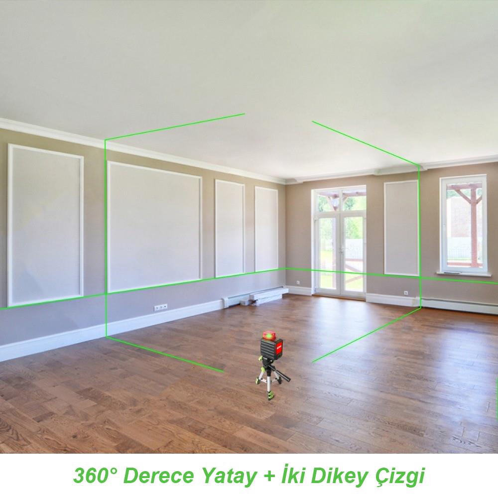 · Bir adet yatay 360⁰ ve iki adet 130⁰ dikey çizgi lazer ile oluşan artı lazer hattı ile son derece net görünürlüğe sahip Yeşil lazer hizalama,