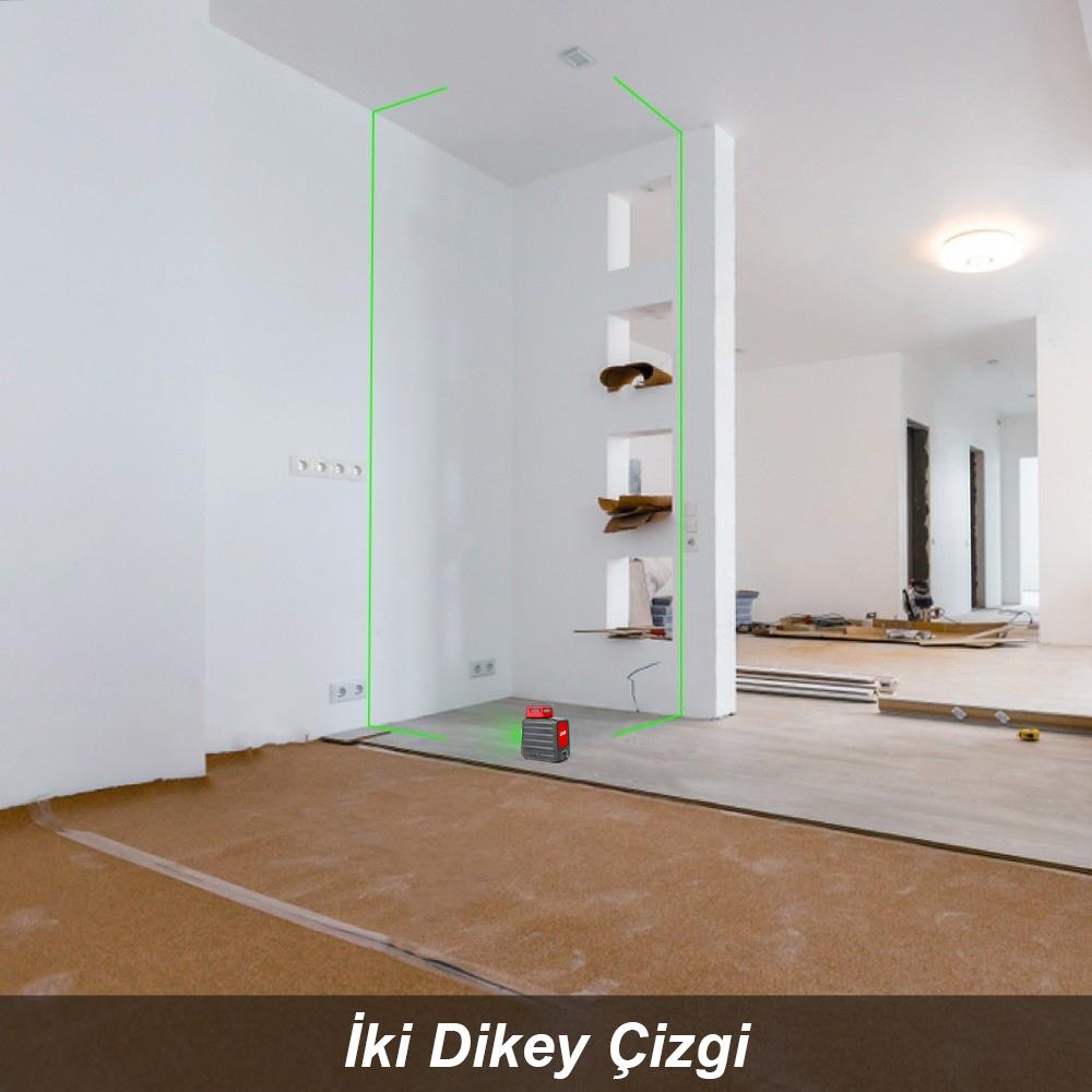 · 90⁰ açı ile iki adet dikey lazer ışınları sayesinde alçıpan bölme odalar, ofisler, fayans işçiliği gibi dekoratif işlemlerin kullanılmasında su terazisi ve hizalama ipi kullanmadan hızlı ve pratik şekilde çözüm oluşturmanızı sağlar.