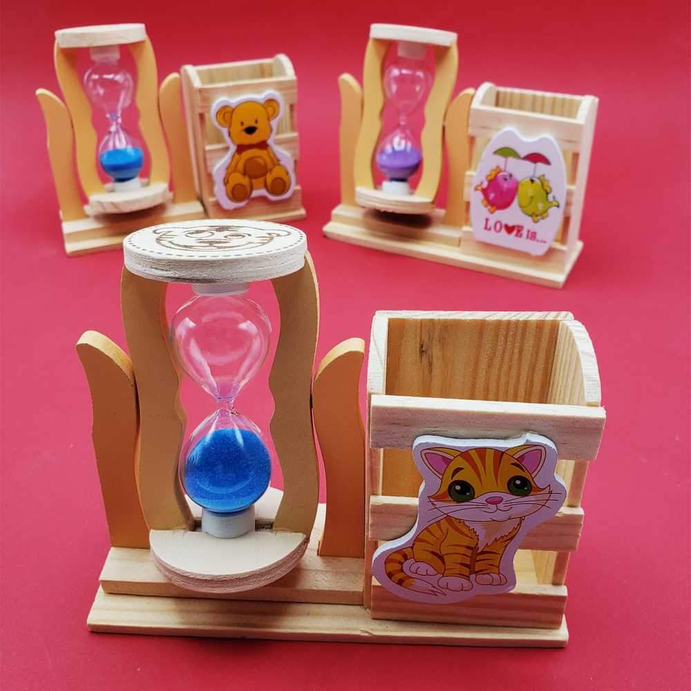 Kum saati şeklindeki kalemlik, şık ve fonksiyonel tasarımıyla dikkat çeker. Ahşap malzemeden üretilen bu ürün, ofis ve çalışma alanlarınızda dekoratif bir dokunuş sağlar. Üzerindeki renkli kum saati, hem estetik hem de işlevsel bir kullanım sunar. 3 farklı kum rengi ile karışık gönderilen bu kalemlik, özellikle çocuk odaları ve çalışma masaları için mükemmel bir seçenektir. Aynı zamanda küçük eşyalarınızı düzenlemek ve dekoratif amaçlar için de kullanılabilir.