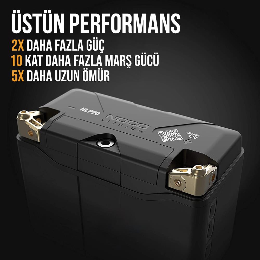 · NOCO NLP20 12V Lityum Power Sport Akü 7Ah (90Wh) ve 600A CCA anlık başlangıç gücü ile rakiplerinin çok üzerinde güç sağlar.