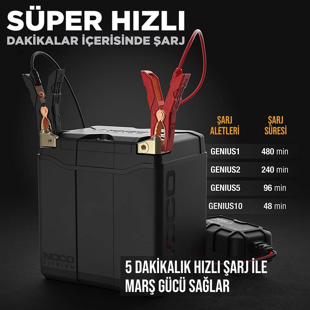 · NOCO GENIUS1, GENIUS2, GENIUS5, GENIUS10 modelleri ile şarj edebilirsiniz veya 14,6Voltluk şarj voltajına sahip 12V Li-ion aküler ile uyumlu şarj aletleri ile şarj edebilirsiniz.