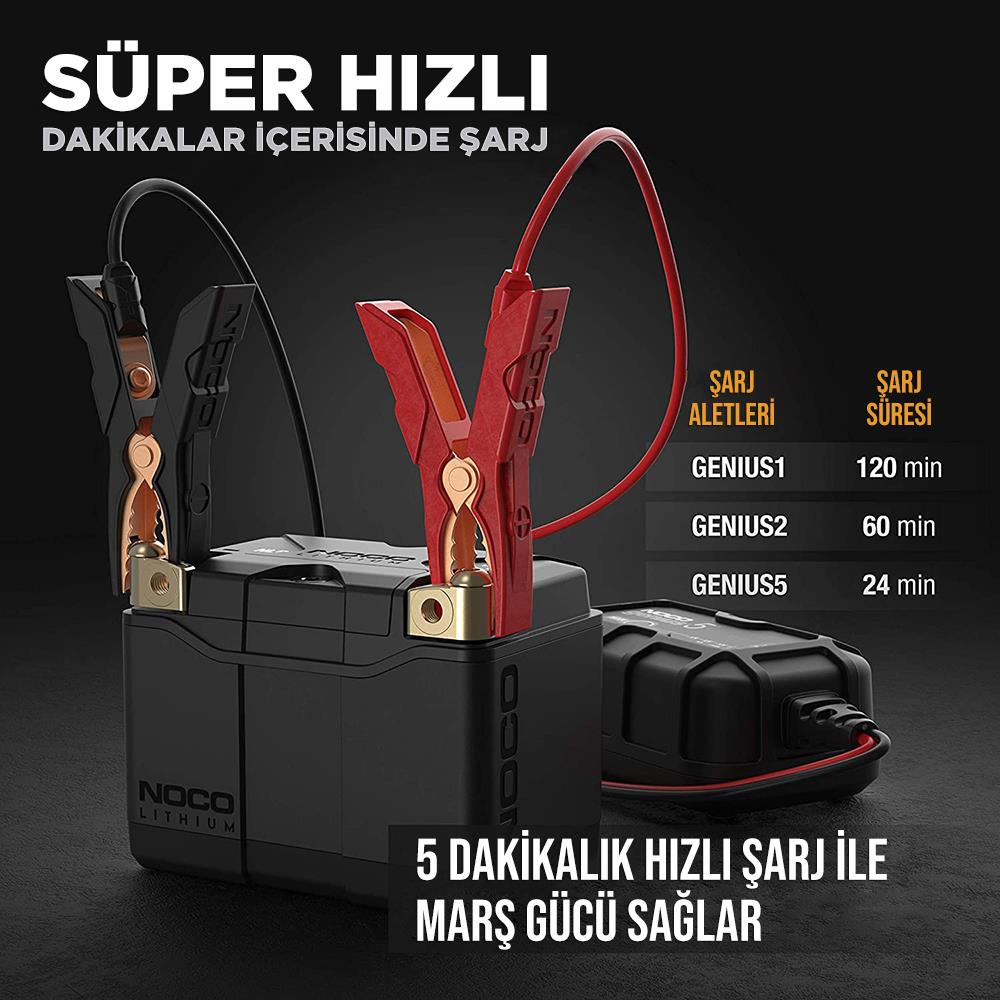 · NOCO GENIUS1, GENIUS2 ve GENIUS5 modelleri ile şarj edebilirsiniz veya 14,6Voltluk şarj voltajına sahip 12V Li-ion aküler ile uyumlu şarj aletleri ile şarj edebilirsiniz.
