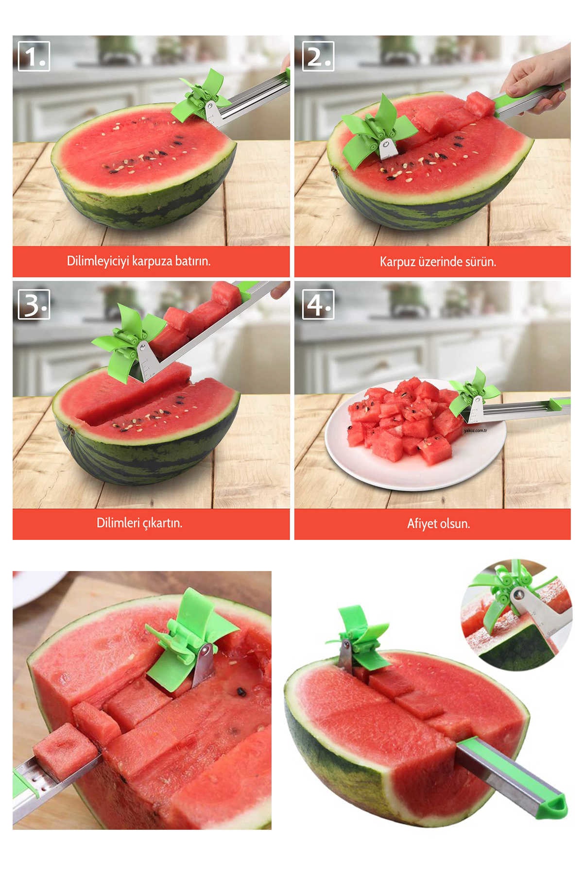 Kullanımı kolay pratik karpuz dilimleyici . Karpuzun yüzeyinde ileriye yada geriye sürerek saniyeler içinde nizami dilimler halinde karpuzu dilimleyebilirsiniz.Kulanımı kolay ergonomik ve hafif tir. Gövdesi paslanmaz çeliktir , kesici köşeleri olmadığı için çocuklarda kullanabilir.Kullanımı;Kesici kısımdan dilediğiniz büyüklüğü ayarlayın.dilimleyiciyi karpuzun üzerinde ileriye sürün.karpuzun kabuğuna ulaşınca yukarı kaldırıp dilimleri alın.Ürün Ebatları;40cmx3.5cmx7cmPaket İçeriği;1 Adet karpuz dilimleyici