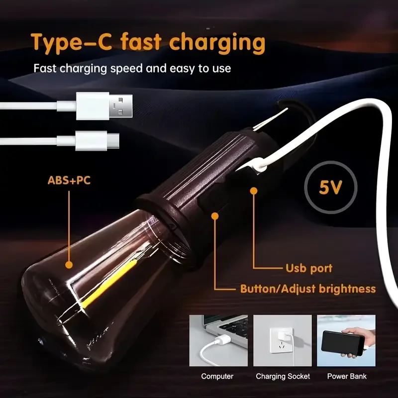Rustik Taşınabilir Şarjlı Tasarruflu Ampul 10W Led Lamba Type-c Şarj Askılı Asma Aydınlatma T020