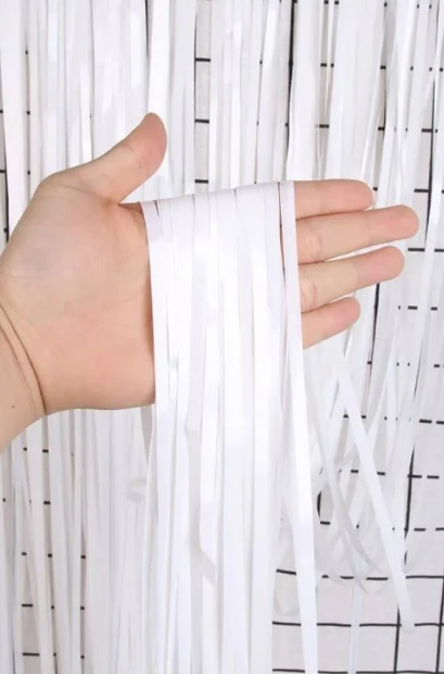 Parti organizasyonlarınızda sadece kapı değil duvar, perde gibi alanları da süsleyebileceğiniz Işıltılı Beyaz Püsküllü Perde.