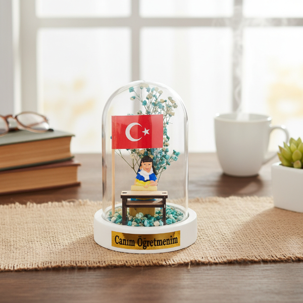 Şık ve anlamlı tasarımıyla dikkat çeken Türk Bayraklı Sıralı Ters Fanus, Öğretmenler Günü’nde duygularınızı zarif bir şekilde ifade etmenizi sağlar. 9x13 cm ölçülerindeki bu özel ürün, içerisinde minyatür öğretmen figürü, masa detayı, renkli çiçek süsleri ve Türk bayrağıyla tamamlanmış estetik bir fanus tasarımına sahiptir.Her bir modelin ön kısmında “Canım Öğretmenim”, “Sevgili Öğretmenim” veya “Öğretmenler Günün Kutlu Olsun” gibi anlamlı yazılar yer alır. Renkli fanus altlıkları ve iç süslemeleri sayesinde masaüstlerinde dekoratif bir hava oluşturur. Model seçimi yapılamaz, görsellerdeki farklı renklerden karışık olarak gönderim yapılır.Fanusun cam benzeri şeffaf koruması sayesinde içerisindeki detaylar net bir şekilde görünür. Dayanıklı malzemesiyle uzun ömürlü bir kullanım sunar ve özel kutu ambalajıyla hediye etmeye hazır şekilde gönderilir. Öğretmenler Günü için etkileyici bir hediye seçeneğidir.