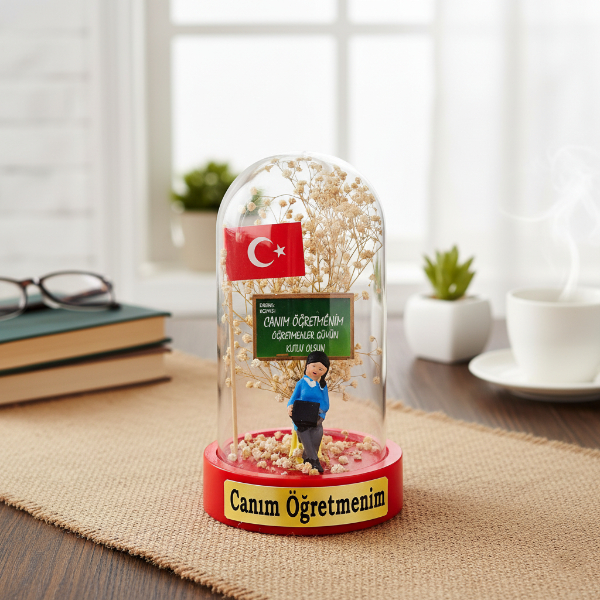 Anlamlı ve estetik tasarımıyla öne çıkan Türk Bayraklı Ters Fanus, Öğretmenler Günü için hazırlanmış zarif bir dekoratif hediye seçeneğidir. 10x18 cm boyutundaki bu özel fanus, içerisinde minyatür öğretmen figürü, renkli kuru çiçekler, masa detayı ve Türk bayrağıyla tamamlanmış etkileyici bir kompozisyona sahiptir.Her modelin üzerinde “Canım Öğretmenim”, “Sevgili Öğretmenim” veya “Öğretmenler Günün Kutlu Olsun” gibi anlamlı ifadeler yer alır. Farklı renk seçenekleriyle tasarlanan modeller, masa üstü veya vitrinlerde sergilenebilecek dekoratif bir görünüm sunar. Model seçimi yapılamaz, görsellerdeki farklı renklerden karışık olarak gönderim yapılır.Fanusun cam benzeri şeffaf koruması, içerisindeki detayların net şekilde görünmesini sağlar. Dayanıklı malzemesi uzun ömürlü kullanım sunarken, özel kutu ambalajı hediyeyi doğrudan sunmaya uygun hale getirir. Öğretmenler Günü için duygusal, şık ve anlamlı bir hediye arayanlar için mükemmel bir tercihtir.