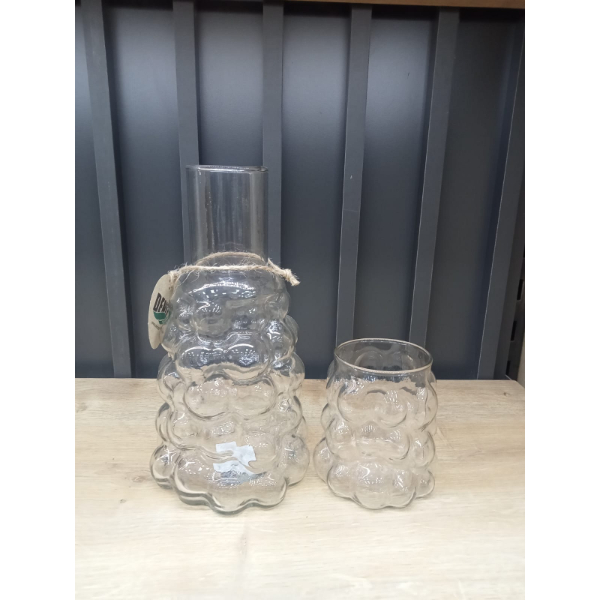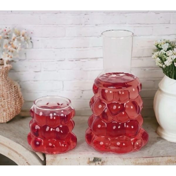 Üzüm desenli başucu sürahisi, şeffaf camdan üretilmiştir ve şık tasarımıyla her ortamda dikkat çeker. Hem dekoratif hem de fonksiyonel olan bu sürahi ve bardağı özellikle yemek masalarında ya da başucunda kullanılmak için idealdir. Üzüm desenleri, ürünün zarif bir görünüme sahip olmasını sağlar. İster soğuk ister sıcak içecekler için kullanılabilir.
