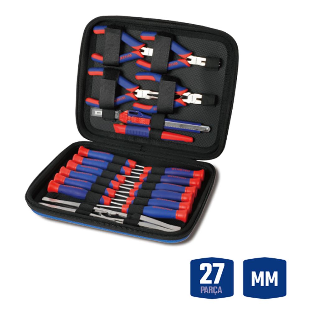 • Hassas elektronikçi Tornavidalar, mini pense, mini kargaburnu, mini yan keski, mini uzun burun pense, 9mm askılı maket bıçağı, hobi maket bıçağı ve yedeği, elektronikçi cımbız setinden oluşmaktadır.