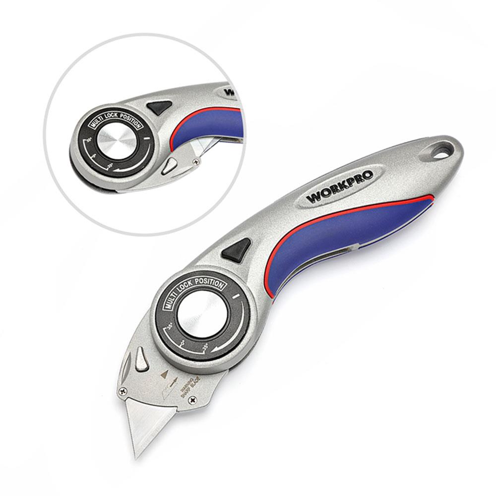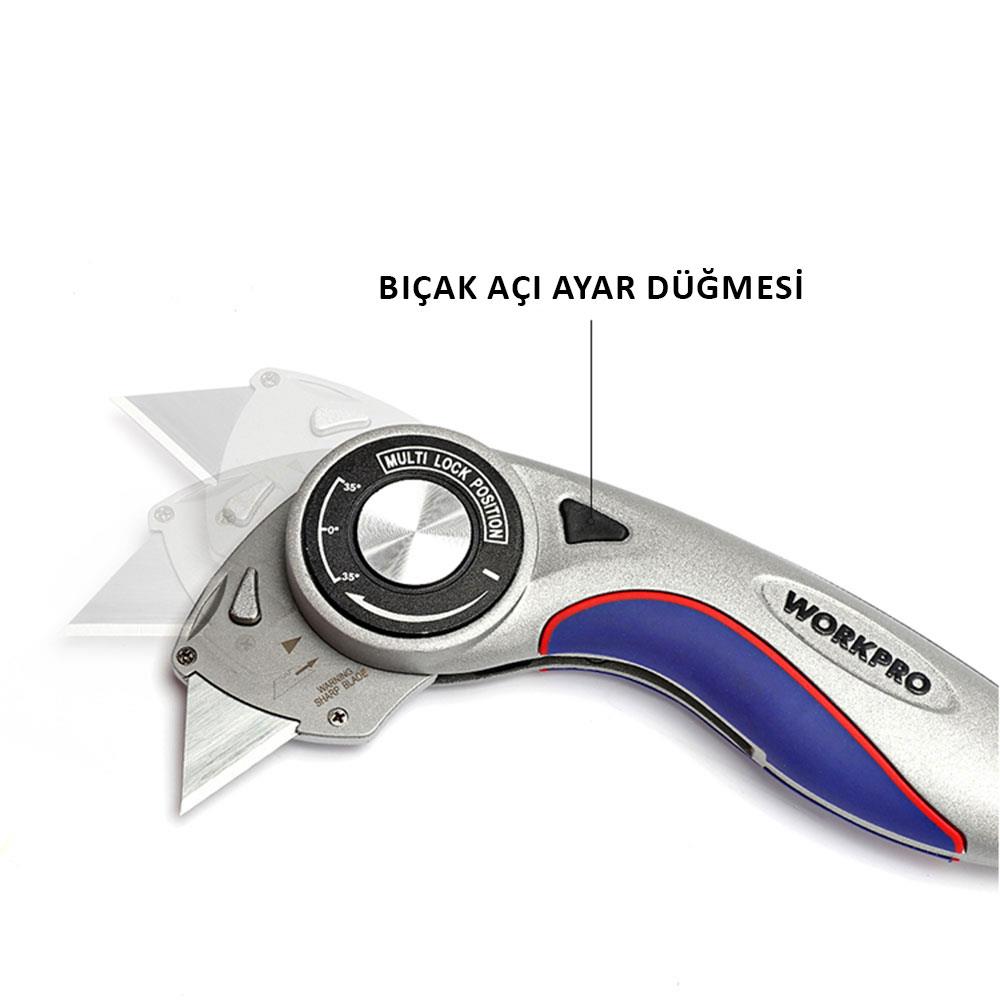 • WORKPRO WP211013 Ağır Hizmet Alüminyum Gövde Açı Ayarlı Katlanır Rötuş Maket Bıçağı + 5 Adet Yedek Bıçak
