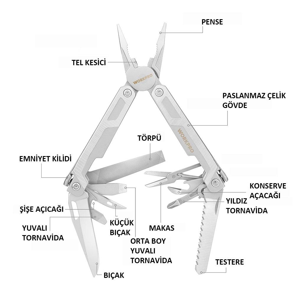 • Pense, Bıçak, Mini Çakı, Mini Makas, Rayba, Eğe, Tornavida, Mini Testere, Gazoz/Konserve Açacağı gibi birçok kullanım alanı sayesinde tek bir alet ile 15 farklı kullanım sağlar.