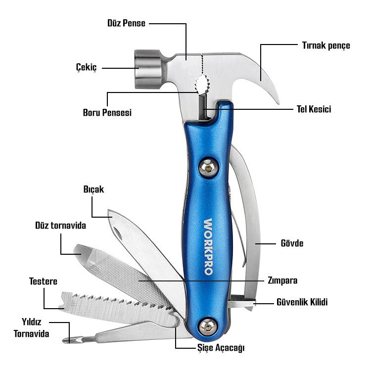 • Kancalı Çekiç, Burunsuz Pense, Bıçak, Tornavida, Eğe, Mini Testere, Gazoz Açacağı gibi birçok kullanım alanı sayesinde tek bir alet ile 12 farklı kullanım sağlar.